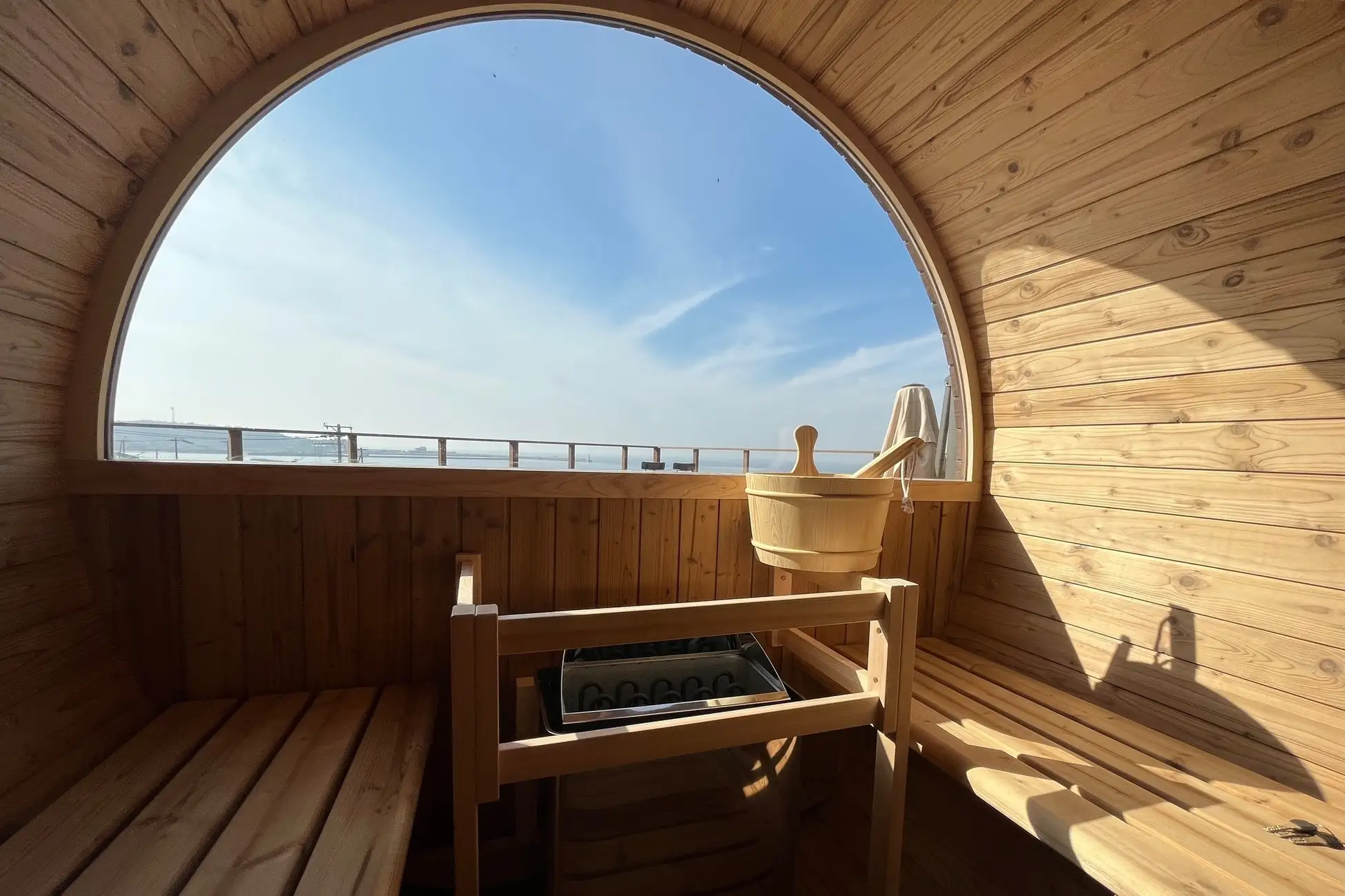 特徴:日本の夕日百選の景色を望むロケーション、バレルサウナ、BBQ設備・ペット備品を完備